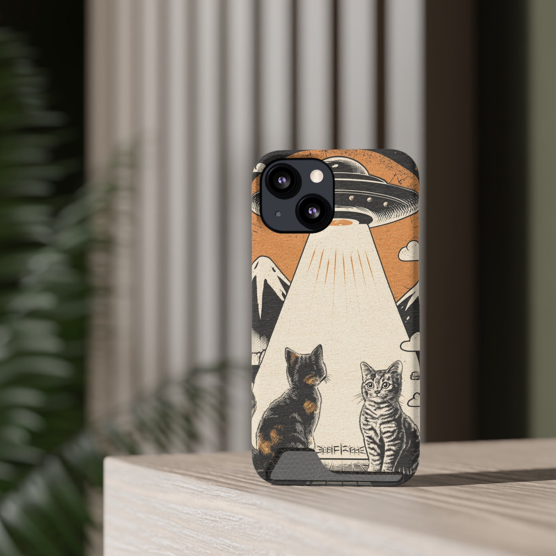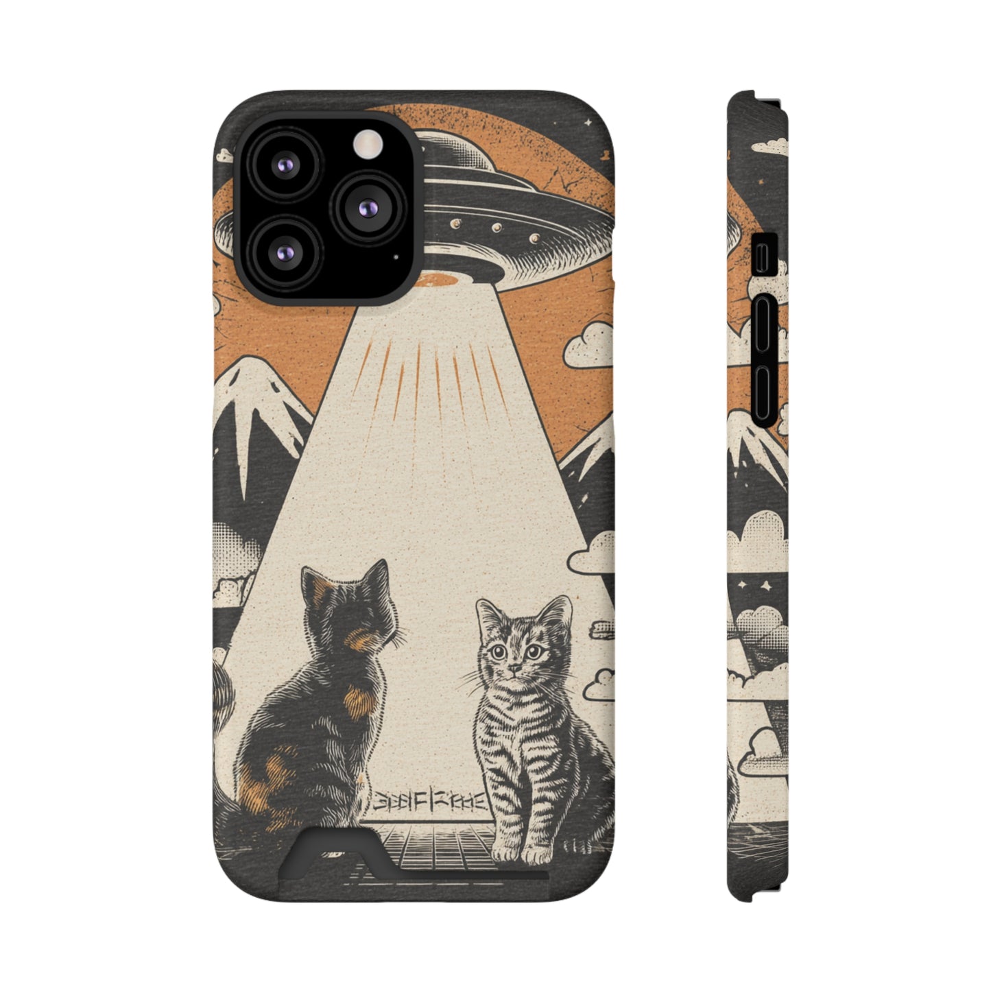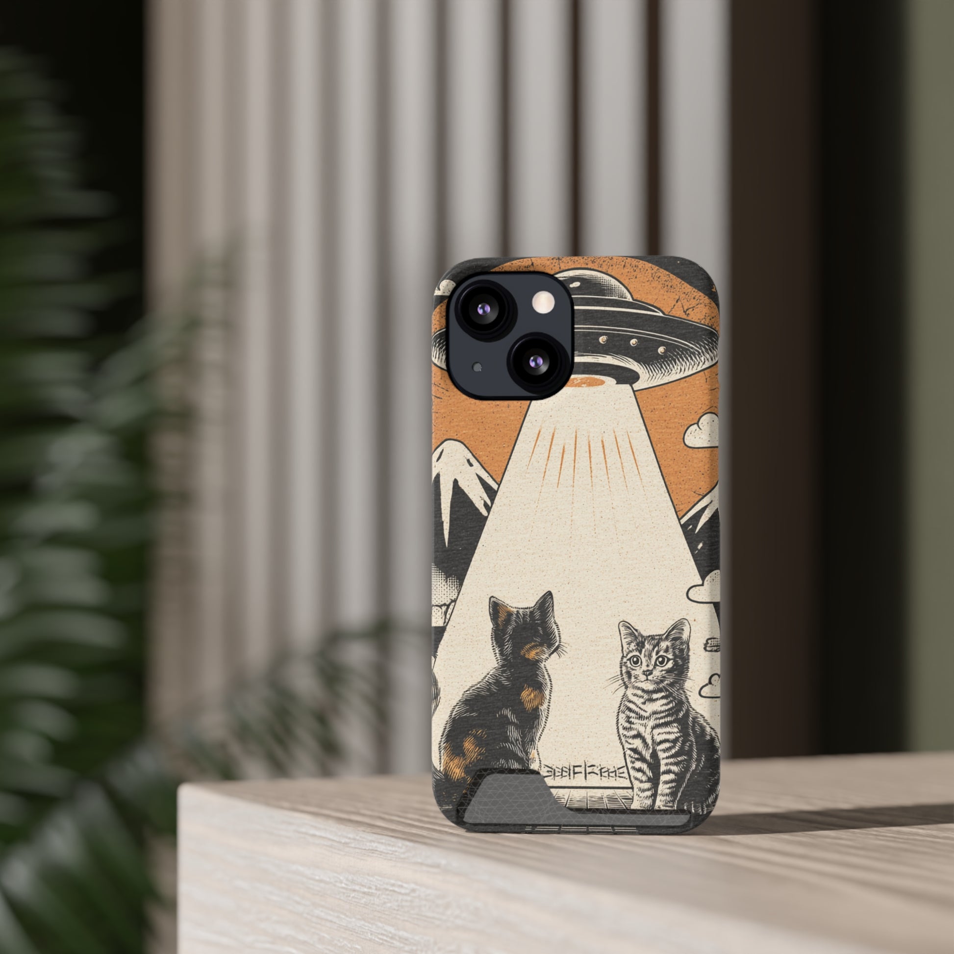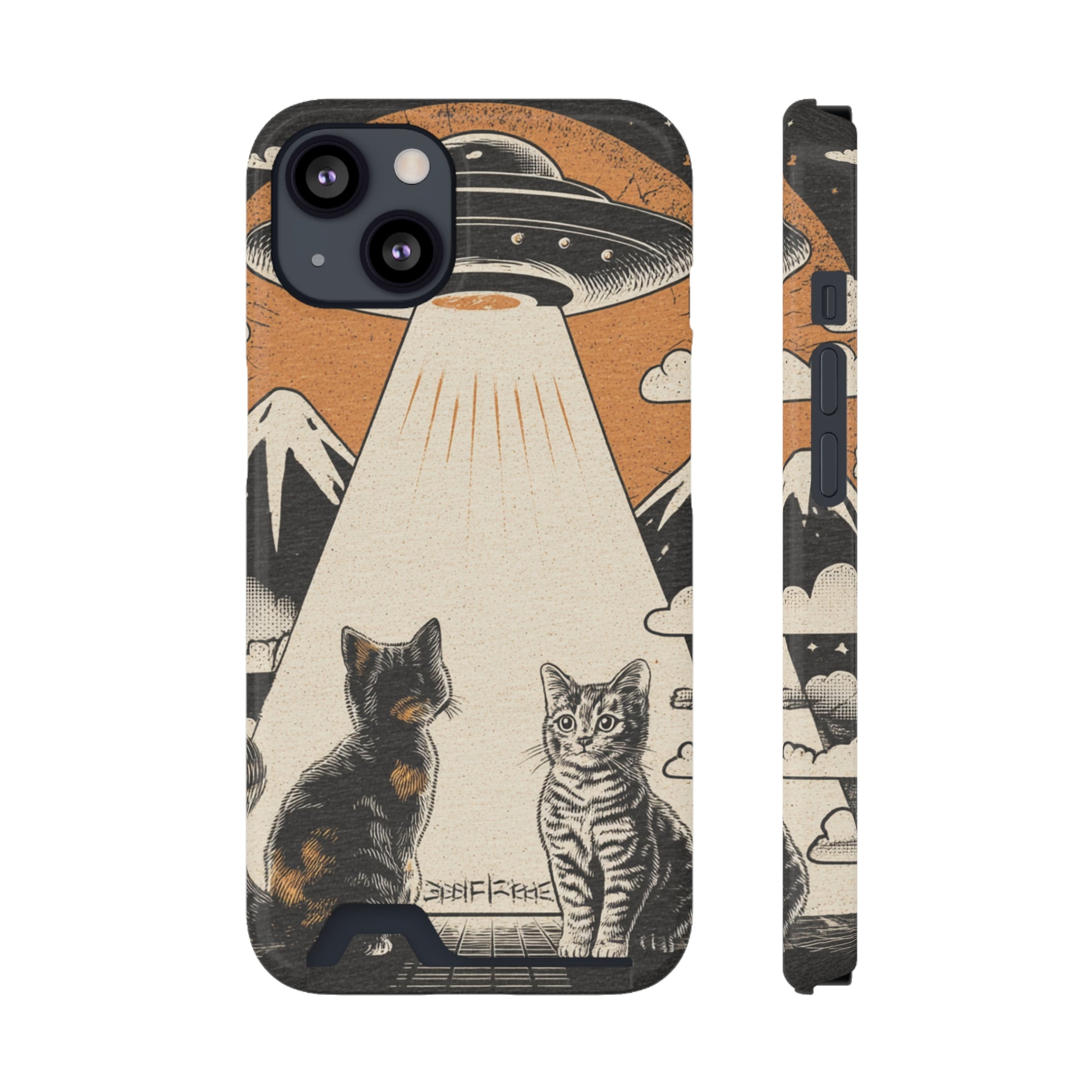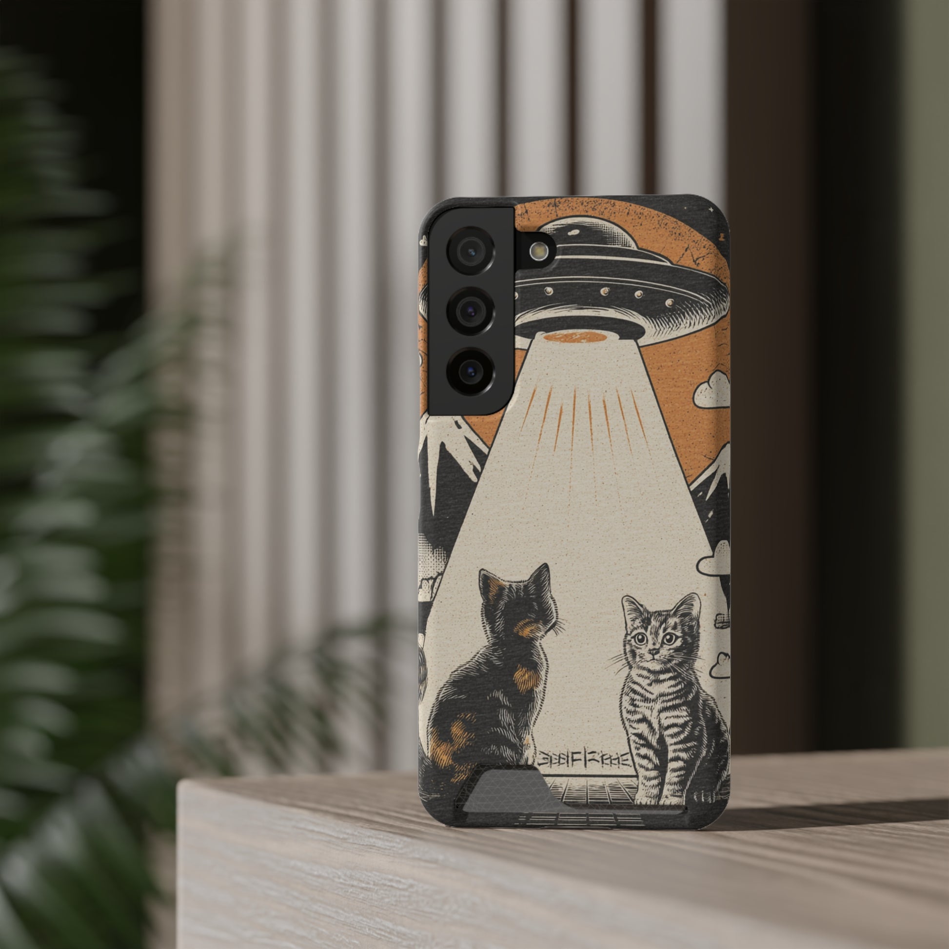 Cat UFO Phone Case with Card Holder, Trendy Cat Lover Gift, Space Theme Accessories, Unique Pet Owner Present, Cute Feline Design