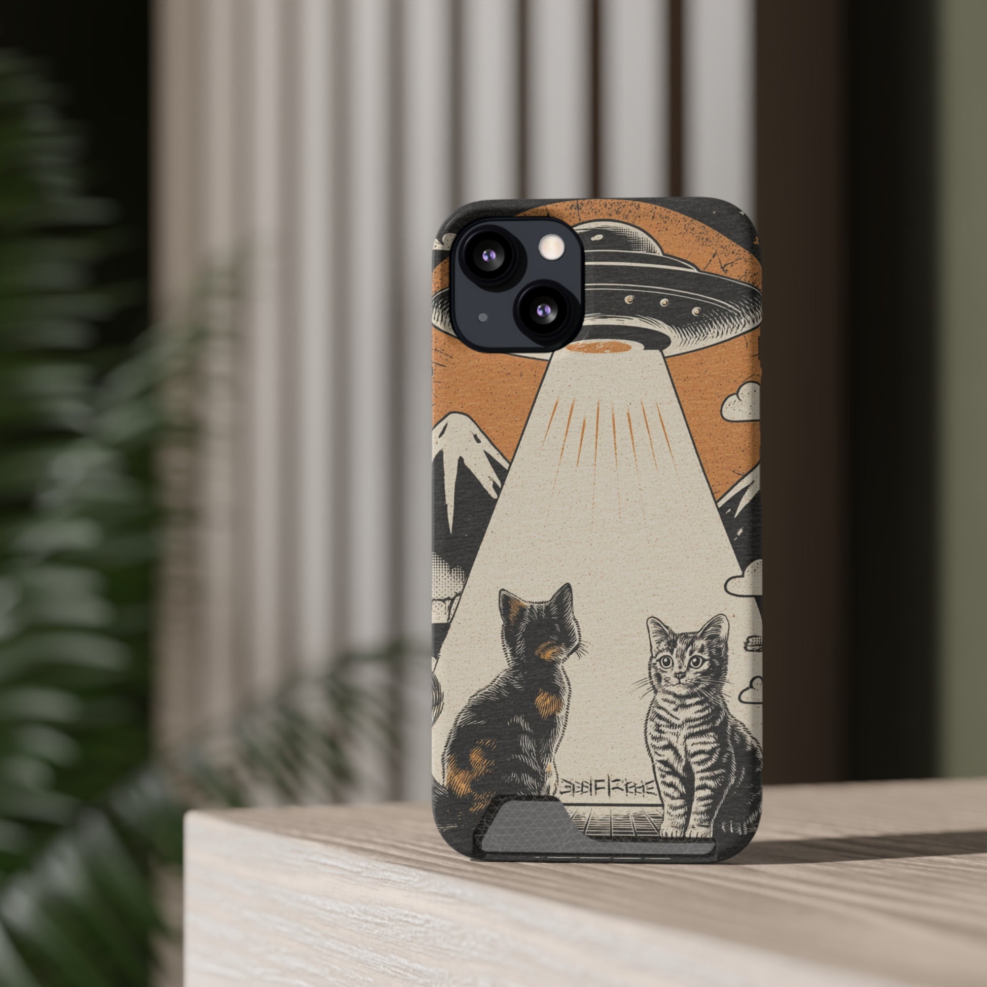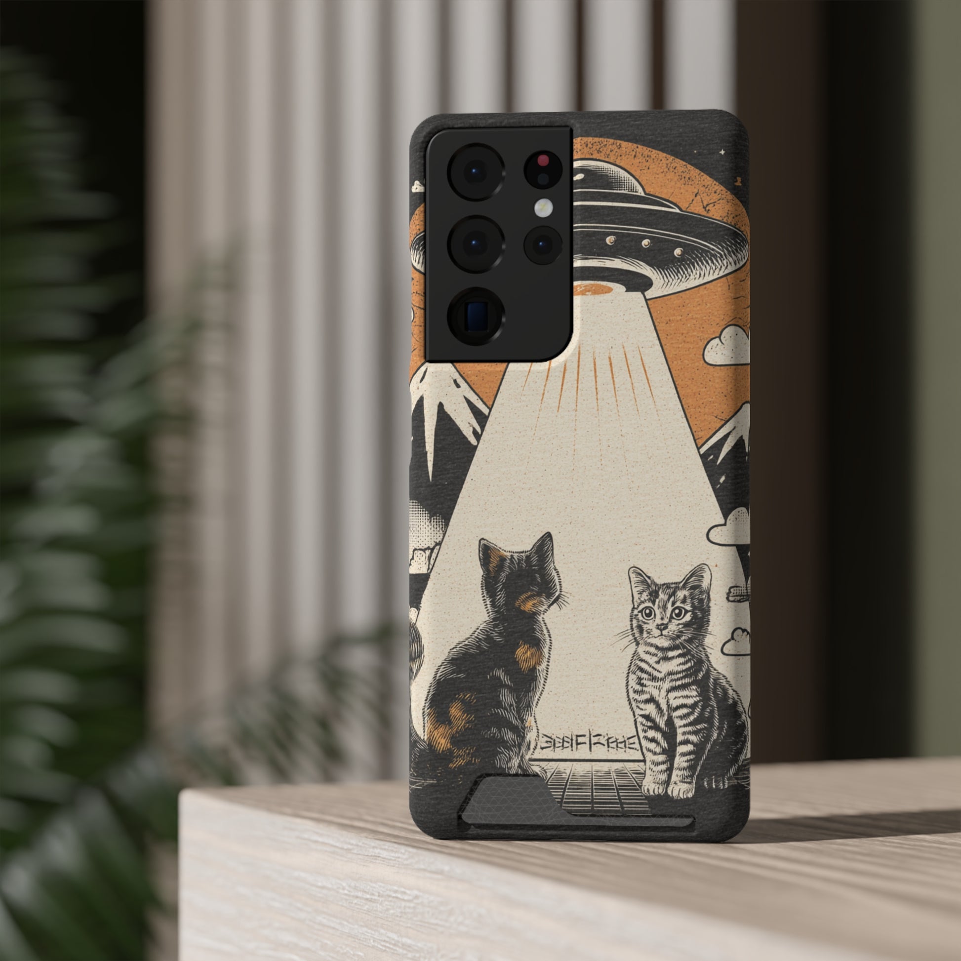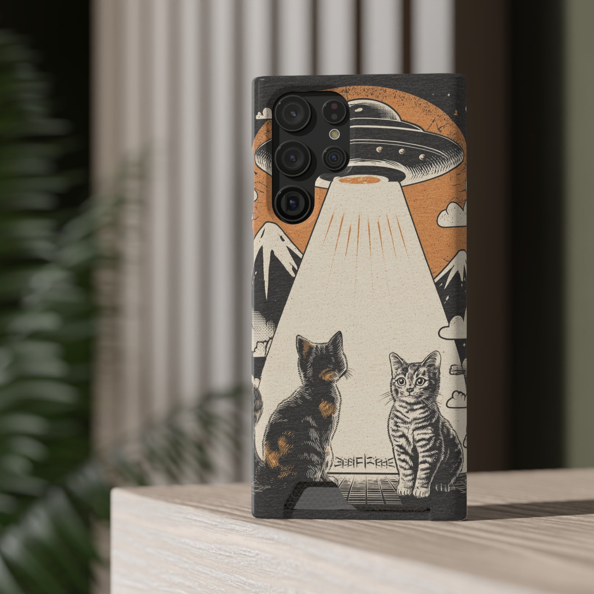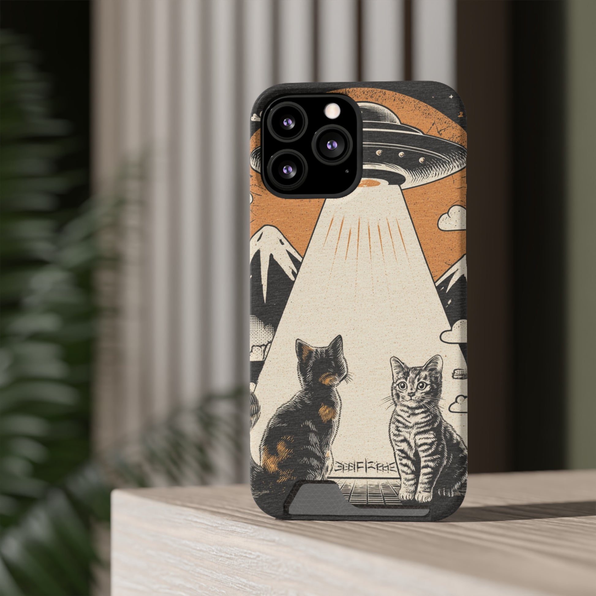 Cat UFO Phone Case with Card Holder, Trendy Cat Lover Gift, Space Theme Accessories, Unique Pet Owner Present, Cute Feline Design