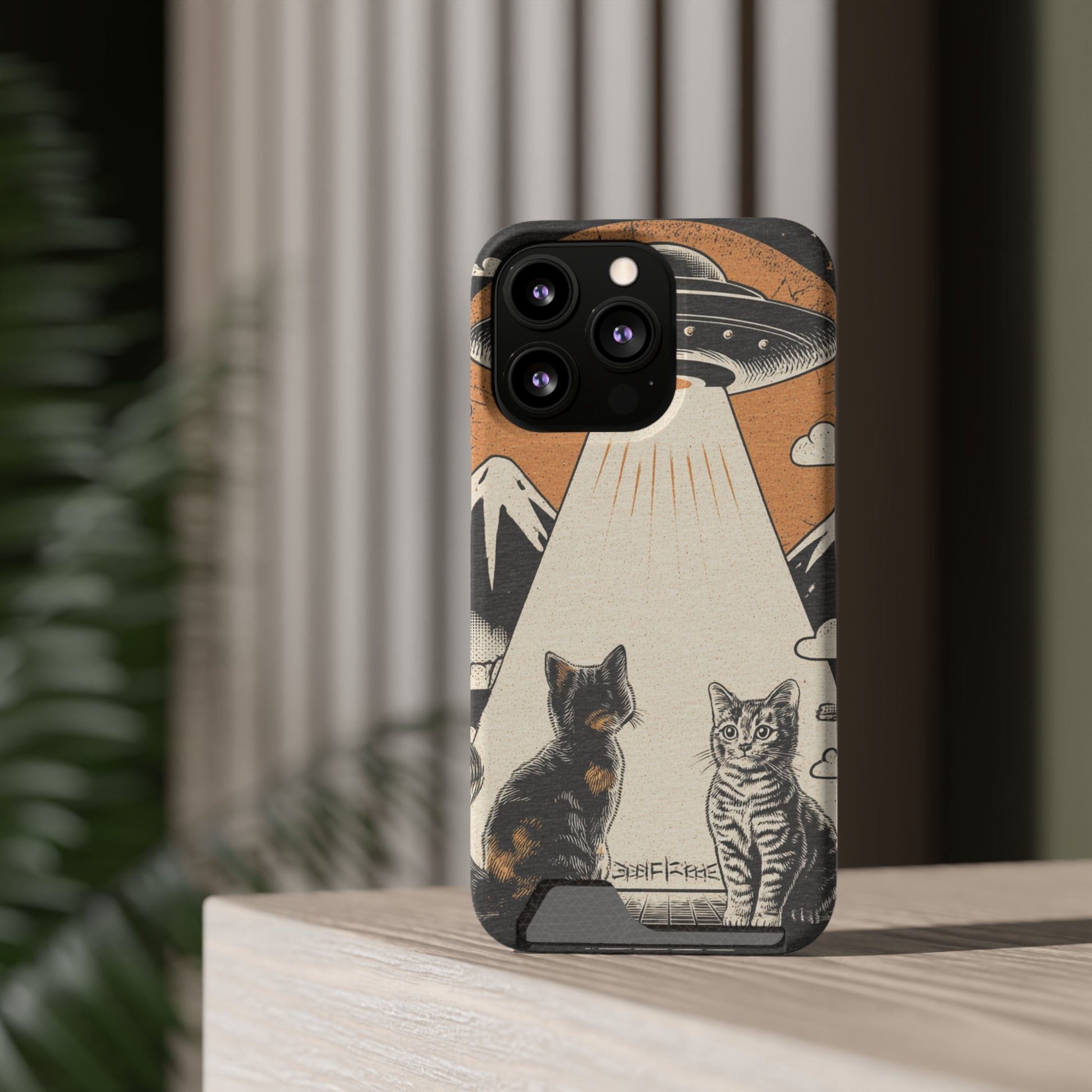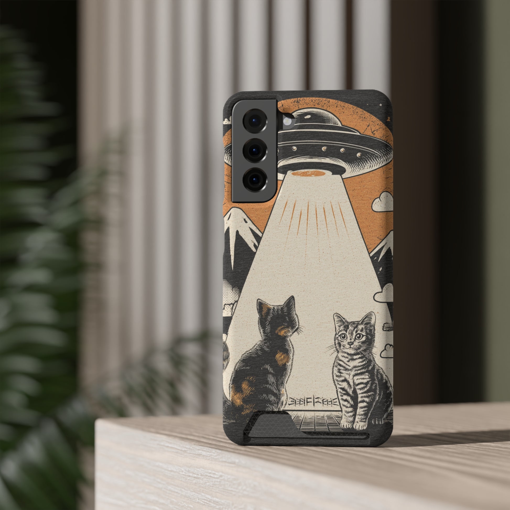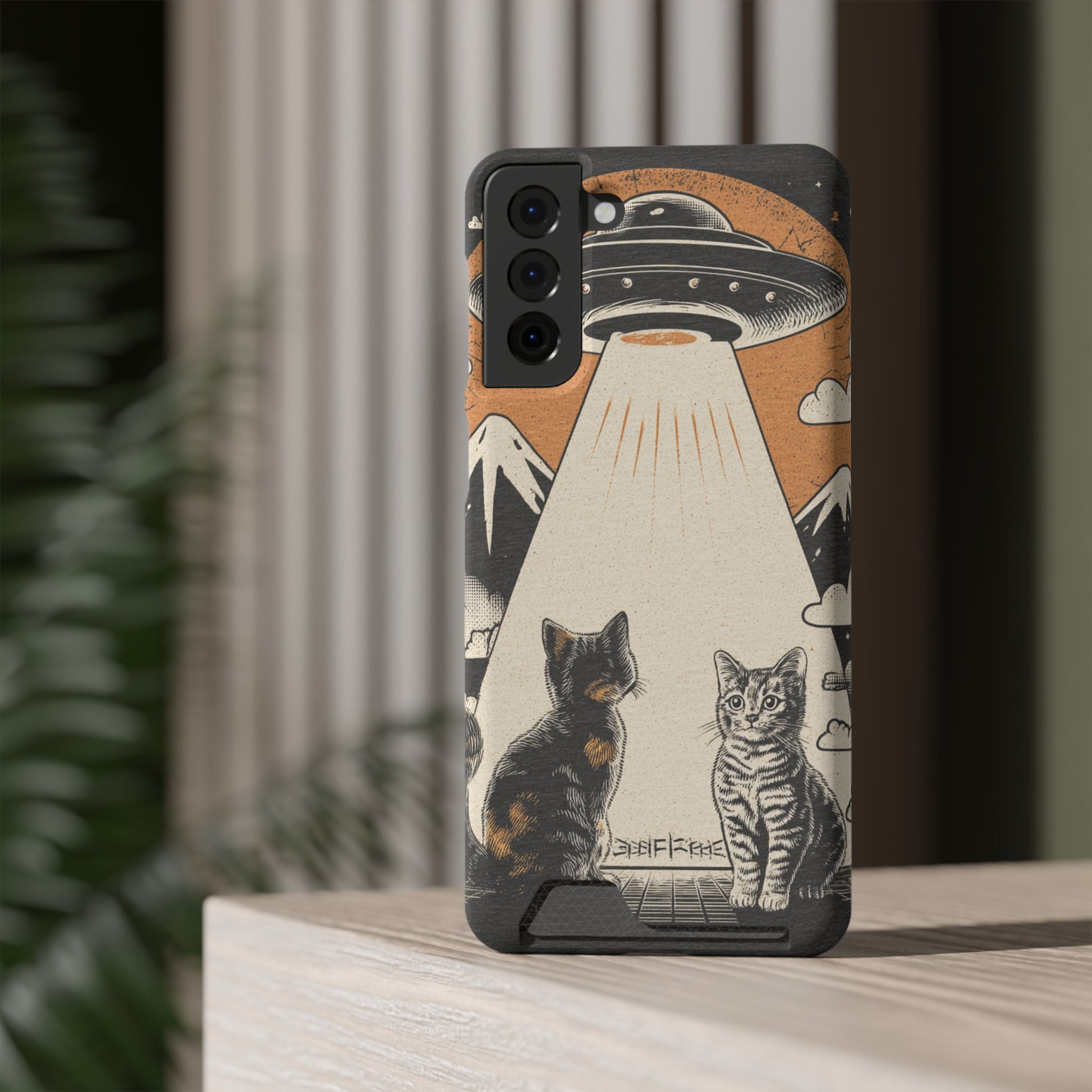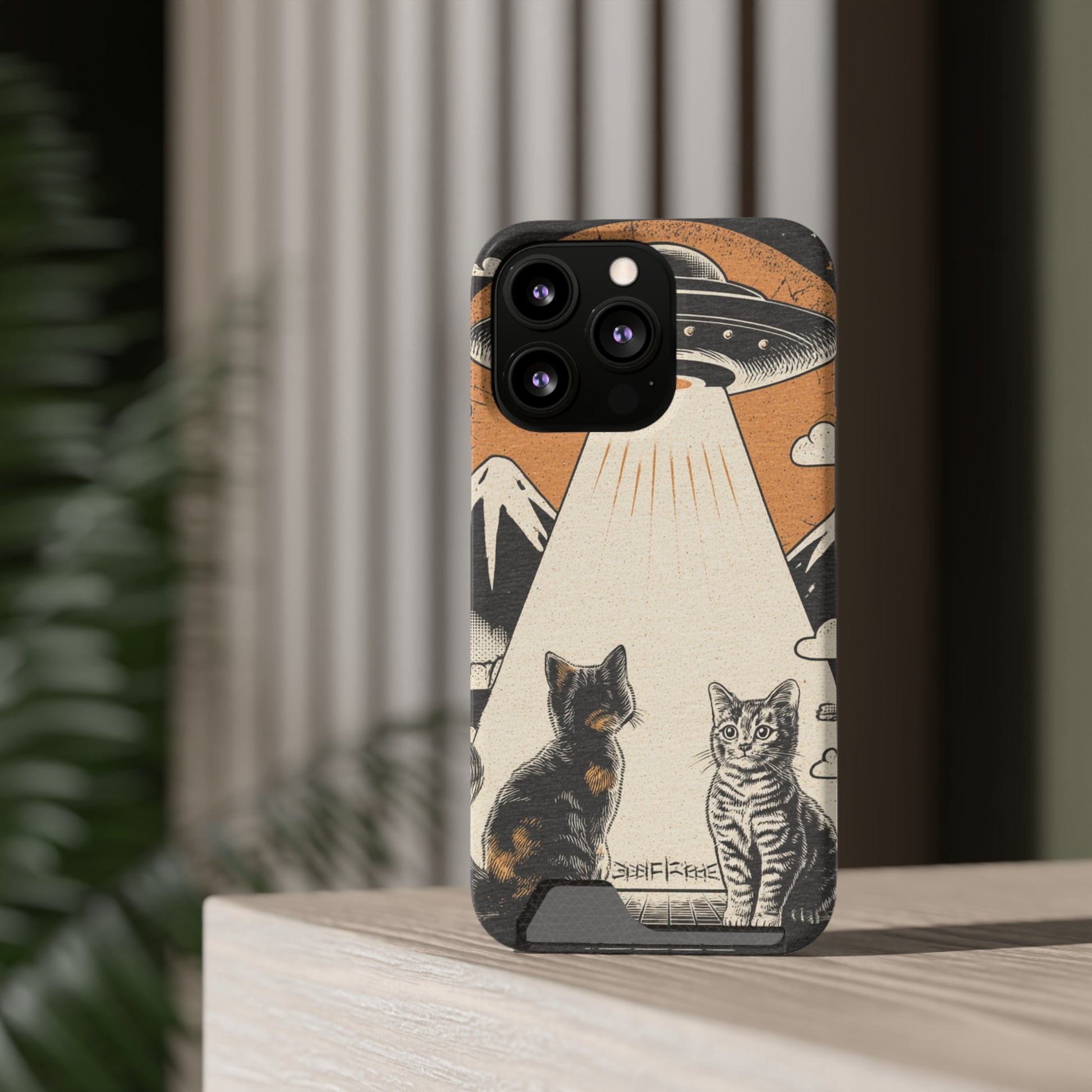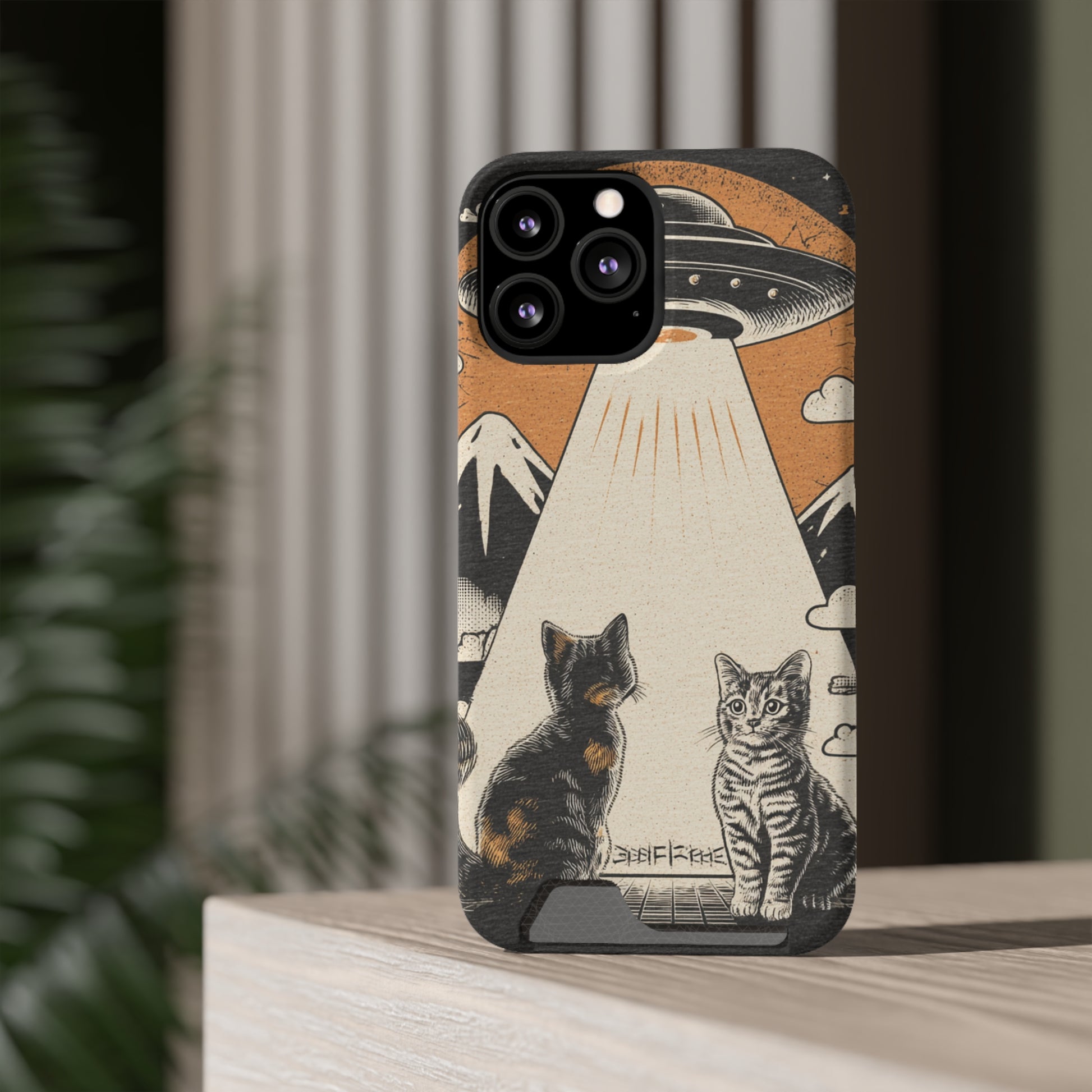 Cat UFO Phone Case with Card Holder, Trendy Cat Lover Gift, Space Theme Accessories, Unique Pet Owner Present, Cute Feline Design